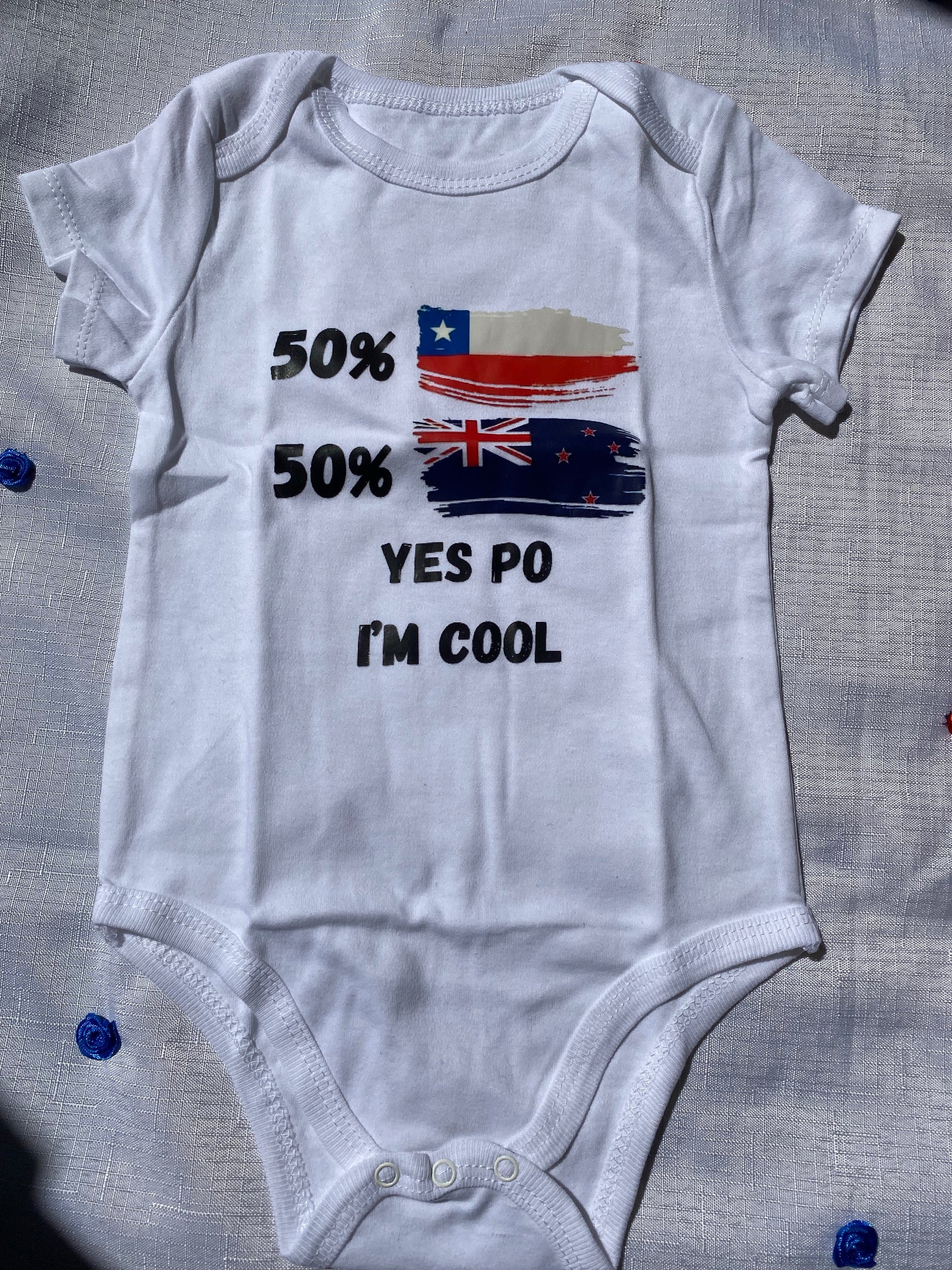 ¡Viste a tu bebé con estilo internacional con nuestro adorable baby romper, una combinación perfecta de 50% Chile y 50% Nueva Zelanda! Este encantador atuendo fusiona lo mejor de dos culturas, brindando un diseño único y exclusivo. Confeccionado con los más suaves materiales, garantiza la comodidad y el bienestar de tu pequeño tesoro. Este romper combina elementos y motivos inspirados en ambos países, creando una prenda llena de encanto y originalidad. ¡Deja que tu bebé luzca con orgullo su herencia diversa y siempre a la moda!